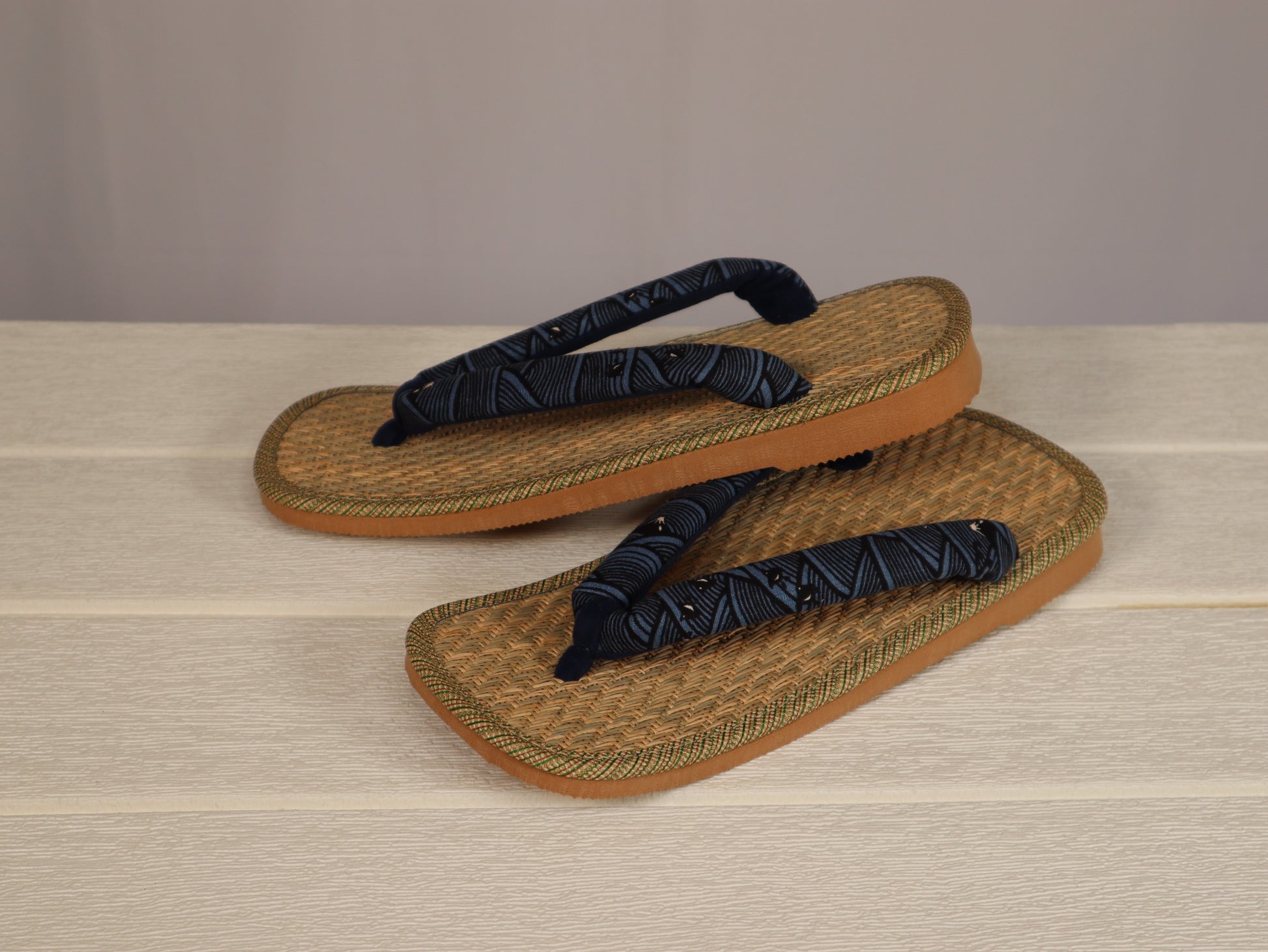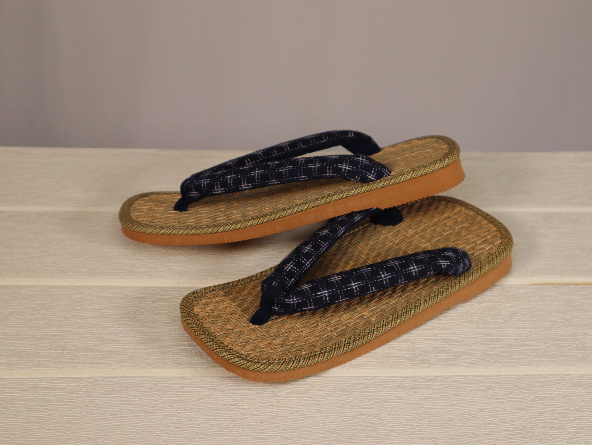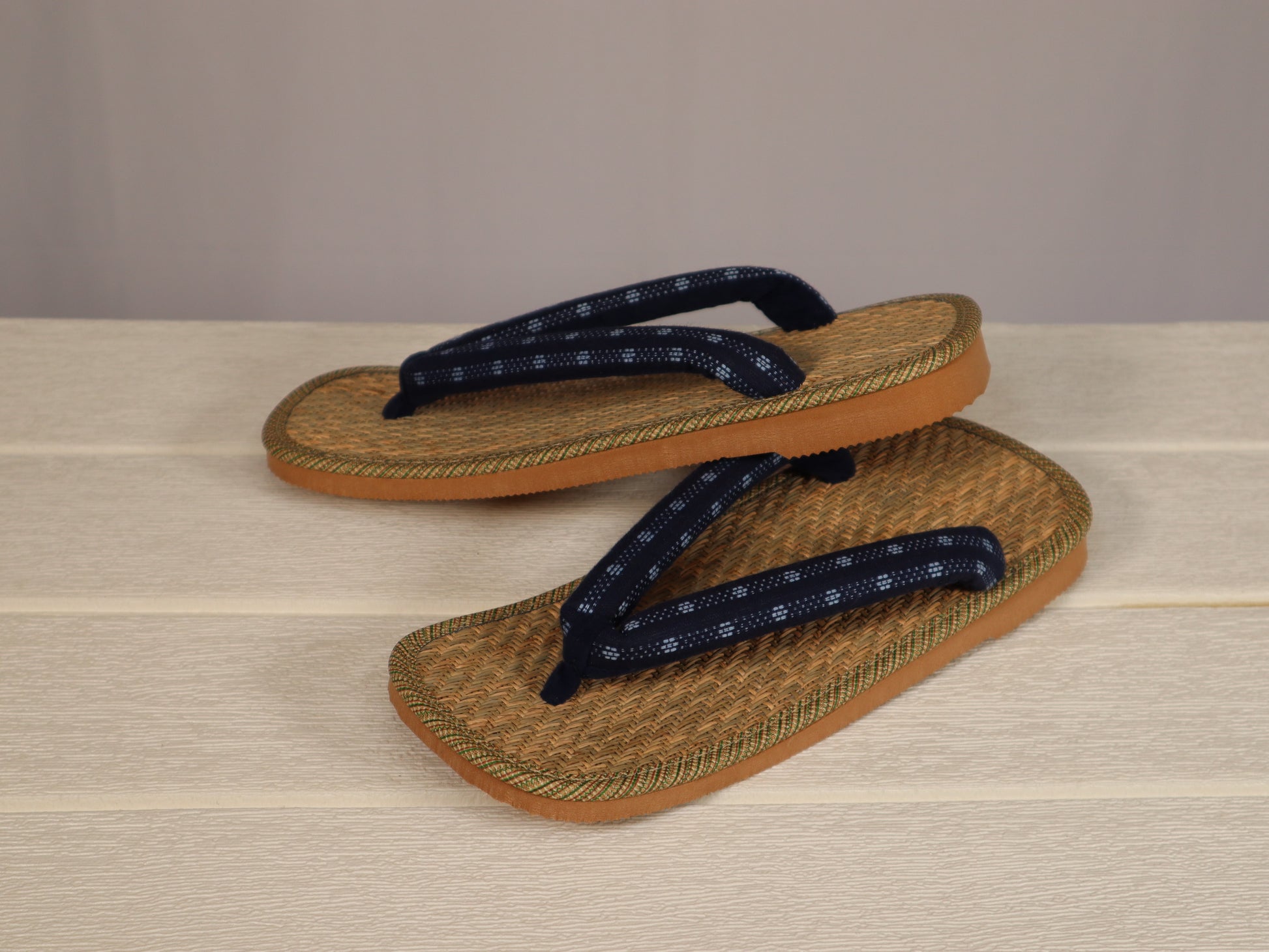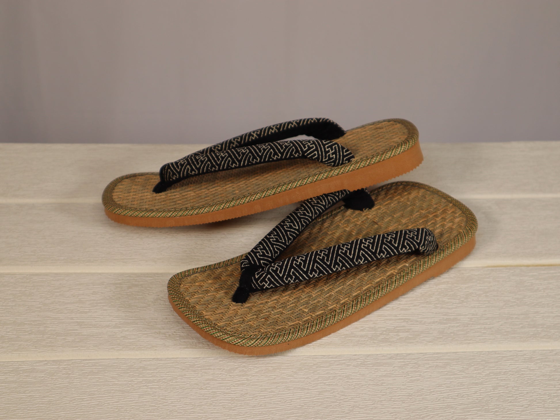 マライ草は耐久性に優れ、パナマ織は風通しの良い織り方で、擦れに強い草履の定番品。